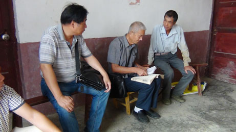 印家禄先生、印成凡先生、印海容先生在潜江市渔洋镇金城2组印家志的家采访
